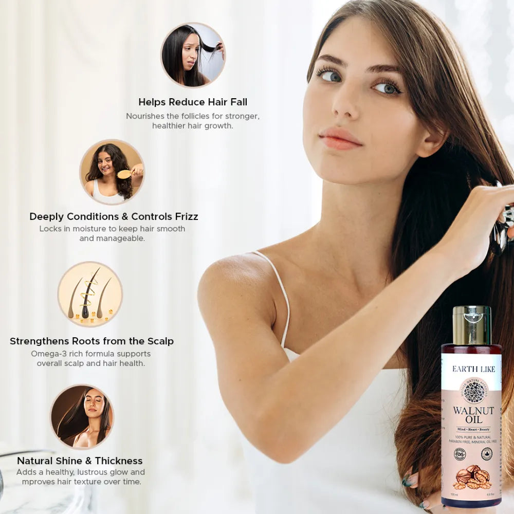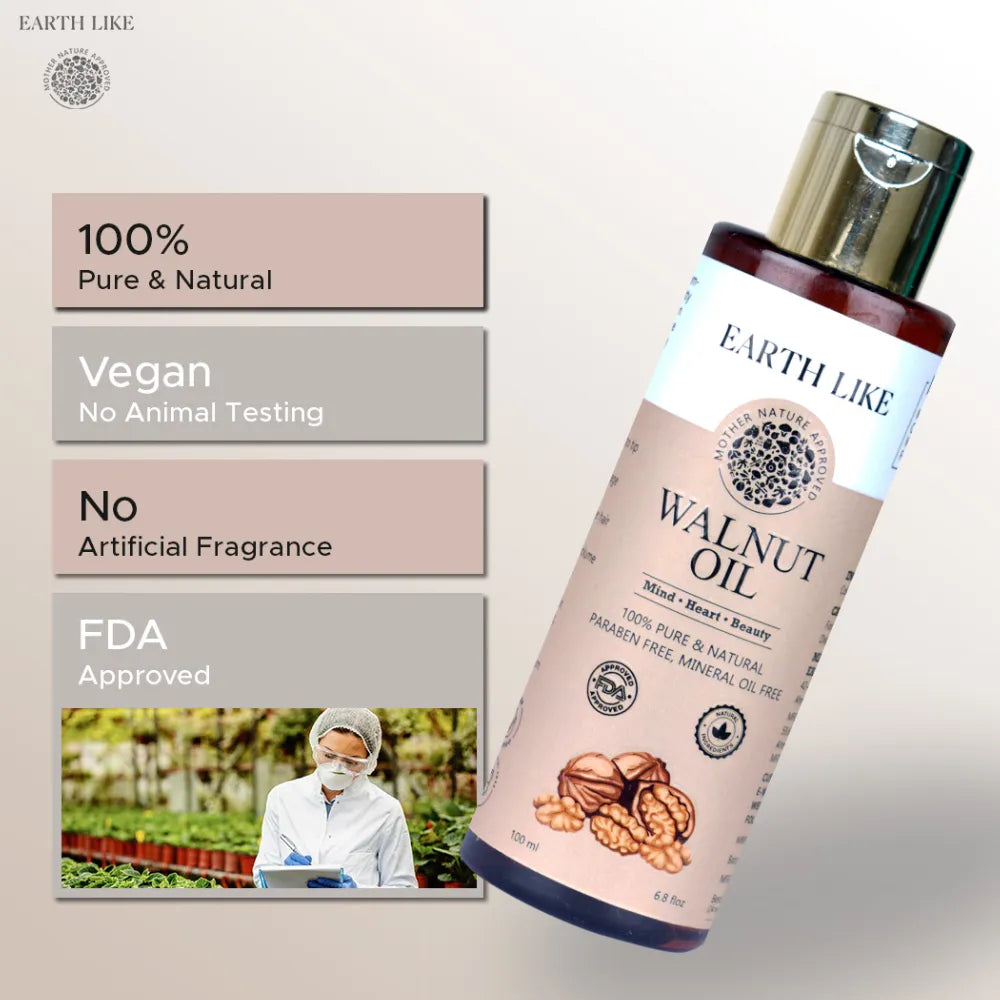 Discover the luxurious care of EarthLike Organics Cold Pressed Walnut Oil, specially crafted for topical application to deeply nourish hair, repair damaged skin and restore natural softness.